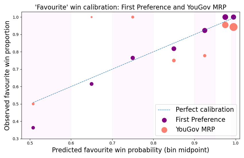 Figure. Comparison of favourite win probabilities with observed favourite win rates for the final YouGov MRP poll and the First Preference model. Alternating purple and white shading indicates bin width. Larger dots indicate a model having a larger number of electorates in that bin.
