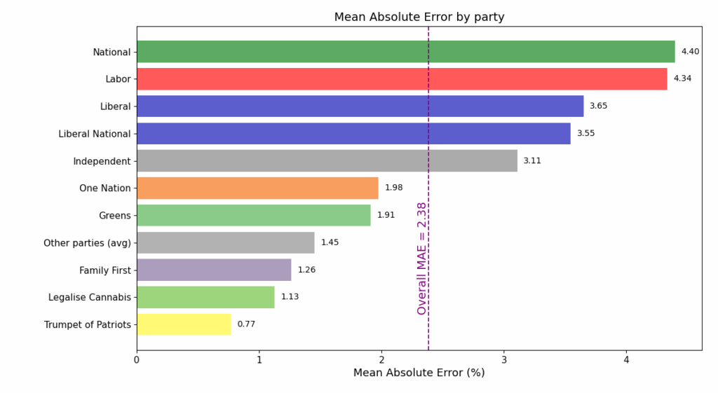 The model's overall MAE was 2.384%: if choosing a candidate at random, you would expect the model's prediction to be off by that amount. This is materially lower than the 3-3.5% seen when testing on the 2016, 2019, and 2022 elections. A reason may be that the model for the 2025 election had access to more data, being trained on all 3 of those years; the others were only trained on 2. It could, however, just be a product of a fairly well-behaved election!